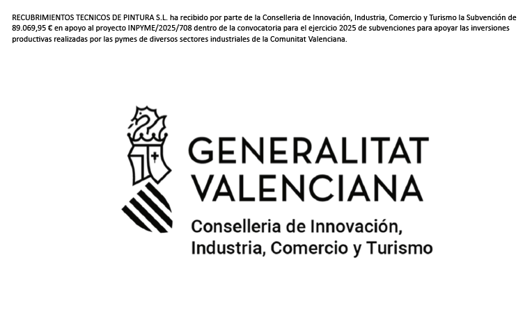 RECUBRIMIENTOS TECNICOS DE PINTURA S.L. ha recibido por parte de la Conselleria de Innovación, Industria, Comercio y Turismo la Subvención de 89.069,95 € en apoyo al proyecto INPYME/2025/708 dentro de la convocatoria para el ejercicio 2025 de subvenciones para apoyar las inversiones productivas realizadas por las pymes de diversos sectores industriales de la Comunitat Valenciana.
